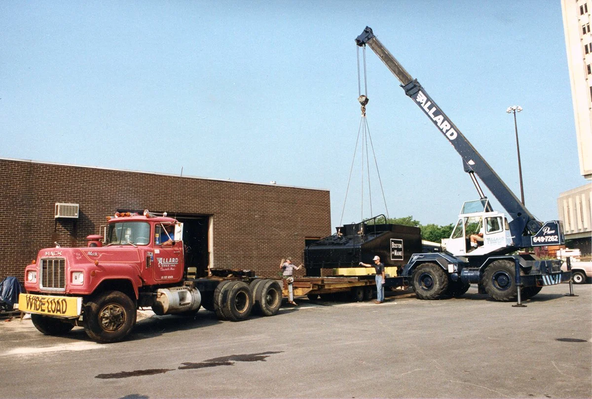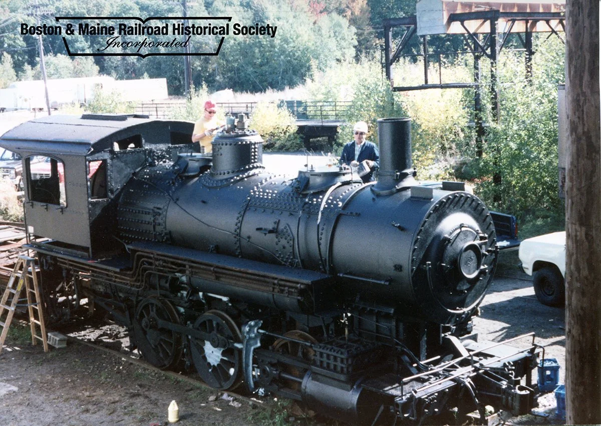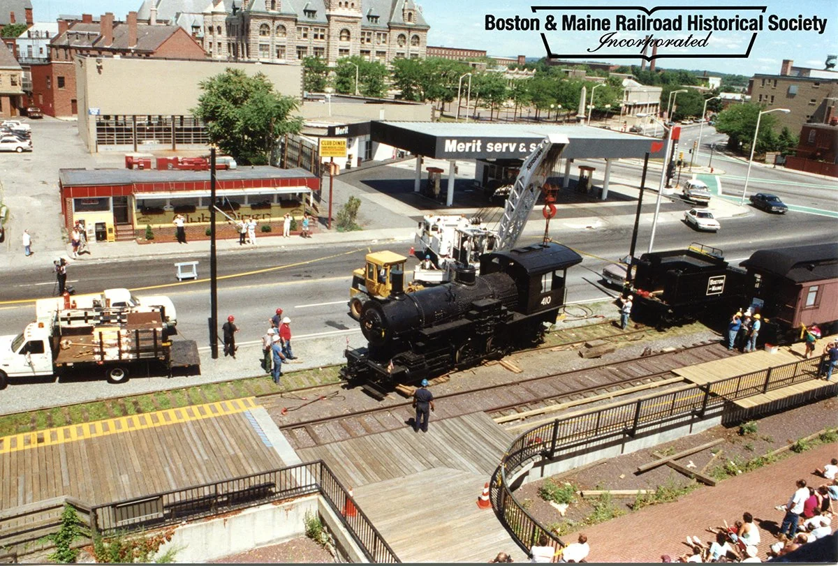 Like all steam-powered engines, No. 410 was rendered obsolete by diesel engines that required far less maintenance. Sold to the H. E. Fletcher Granite Company in Westford, Massachusetts on June 28, 1950, No. 410 worked in a quarry until her flue time expired and she was replaced by another retired B&M steam switcher in April 1952. Later, No. 410 was acquired by the Commonwealth of Massachusetts for preservation at the Museum of Transportation in Boston and was moved to the B&M Shops at North Billerica, Massachusetts. This plan was not realized, however, and through the efforts of national, state, and local agencies No. 410 was brought to Lowell on July 17, 1993. The Society has been involved with the restoration since 1992 when a group of our members started working on the engine at North Billerica. By the time it arrived at Lowell, brought by rail and then lifted by crane to the track where she now sits, No. 410 had been scraped, painted, and lettered by NPS and B&MRRHS volunteers. Click here to view the project log!